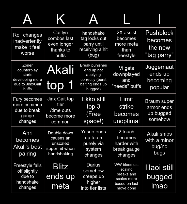 This bingo card has a free space and 24 words: Double down causes an unscaled super hit when handshaking, Blitz ends up meta, Break punishes end up not applying correctly (burst baiting ends up bugged), Freestyle falls off slightly due to handshake changes, Pushblock becomes the new "tag parry", Roll changes inadvertently make it feel worse, Zoner counterplay starts developing more due to Jinx/Cait buffs, Caitlyn combos last even longer thanks to buffs, Limit strike becomes unoptimal, Yasuo ends up top 5 purely via system changes, Vi gets downplayed and "needs" buffs, Fury becomes more common due to break gauge changes, 2 touch becomes harder with break gauge changes, Akali ships with a minor bug/no bugs, Akali top 1, WW bloodlust scaling breaks and scales more based on last move done, Braum super armor ends up bugged somehow, handshake tag locks out parry until receiving a hit (bug), Juggernaut ends up becoming popular, Jinx Cait top tier /time outs become more common, Illaoi still bugged lmao, Ahri becomes Akali's best pairing, 2X assist becomes more meta than freestyle and Darius somehow creeps up higher into tier lists.