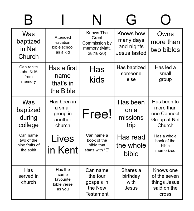 This bingo card has a free space and 24 words: Lives in Kent, Has the same favourite bible verse as you, Has kids, Has served in church, Owns more than two bibles, Was baptized in Net Church, Can recite John 3:16 from memory, Attended vacation bible school as a kid, Has been on a missions trip, Can name a book of the bible that starts with “E”, Has baptized someone else, Was baptized during college, Has read the whole bible, Has a whole book of the bible memorized, Has a first name that’s in the Bible, Shares a birthday with Jesus, Has been to more than one Connect Group at Net Church, Knows The Great Commission by memory (Matt. 28:18-20), Has led a small group, Has been in a small group in another church, Knows one of the seven things Jesus said on the cross, Can name two of the nine fruits of the spirit, Knows how many days and nights Jesus fasted and Can name the four gospels in the New Testament.
