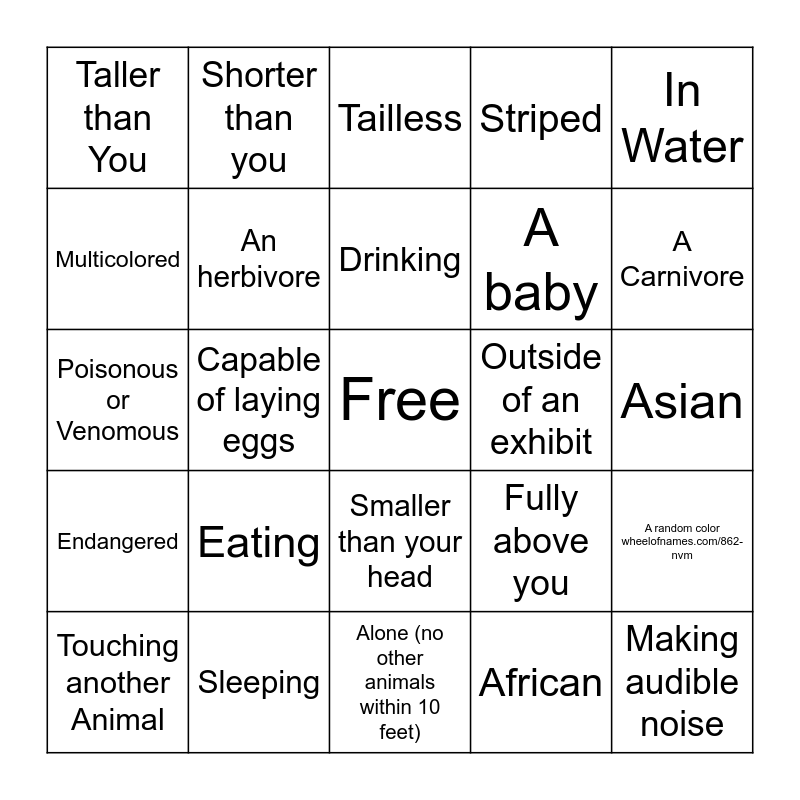 This bingo card has a free space and 24 words: Eating, Sleeping, Drinking, Touching another Animal, In Water, Taller than You, Multicolored, Shorter than you, Outside of an exhibit, Smaller than your head, A baby, Poisonous or Venomous, Fully above you, A random color wheelofnames.com/862-nvm, An herbivore, African, Asian, Tailless, A Carnivore, Capable of laying eggs, Making audible noise, Endangered, Striped and Alone (no other animals within 10 feet).