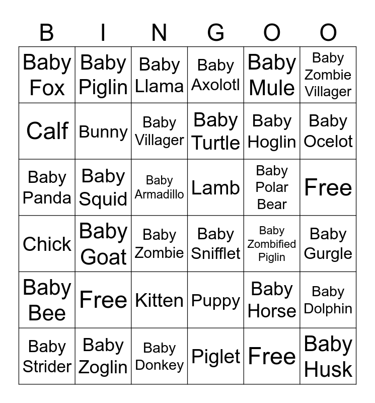 This bingo card has 36 words: Puppy, Kitten, Piglet, Calf, Chick, Lamb, Bunny, Baby Donkey, Baby Mule, Baby Horse, Baby Ocelot, Baby Axolotl, Baby Dolphin, Baby Squid, Baby Turtle, Baby Fox, Baby Bee, Baby Polar Bear, Baby Panda, Baby Llama, Baby Armadillo, Baby Goat, Baby Snifflet, Baby Zombie, Baby Zombified Piglin, Baby Piglin, Baby Hoglin, Baby Zoglin, Baby Villager, Baby Zombie Villager, Baby Husk, Baby Strider, Baby Gurgle, Free, Free and Free.