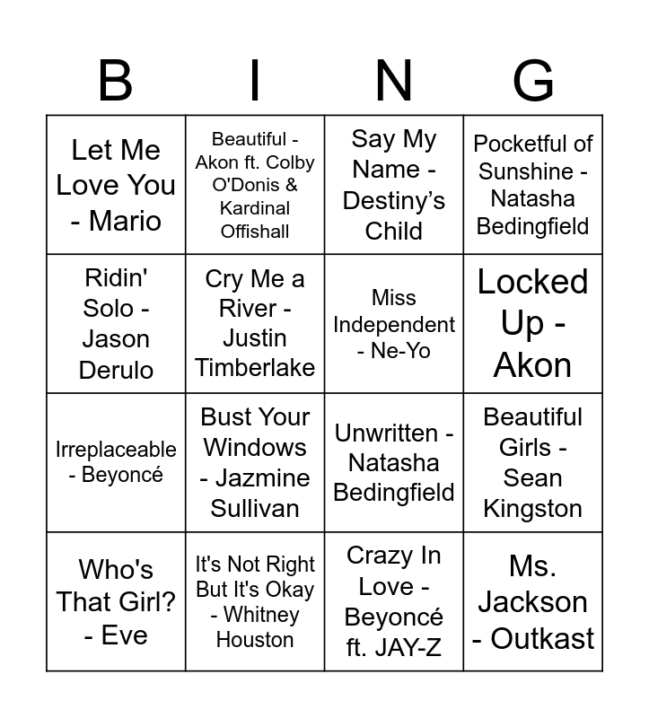 This bingo card has 31 words: FREE, No Scrubs - TLC, Beautiful Girls - Sean Kingston, Nothin' on You - B.o.B ft. Bruno Mars, Let Me Love You - Mario, Say My Name - Destiny’s Child, Miss Independent - Ne-Yo, Dilemma - Nelly ft. Kelly Rowland, It's Not Right But It's Okay - Whitney Houston, If I Ain't Got You - Alicia Keys, Crazy In Love - Beyoncé ft. JAY-Z, Who's That Girl? - Eve, Unfoolish - Ashanti, No Air - Jordin Sparks ft. Chris Brown, Bust Your Windows - Jazmine Sullivan, Kiss Me Thru The Phone - Soulja Boy ft. Sammie, Say It Right - Nelly Furtado, Airplanes - B.o.B ft. Hayley Williams, Ms. Jackson - Outkast, Pon de Replay - Rihanna, Ridin' Solo - Jason Derulo, Always On Time - Ja Rule ft. Ashanti, Killing Me Softly With His Song - Fugees, Beautiful - Akon ft. Colby O'Donis & Kardinal Offishall, Irreplaceable - Beyoncé, Cry Me a River - Justin Timberlake, Pocketful of Sunshine - Natasha Bedingfield, Unwritten - Natasha Bedingfield, I'm Like a Bird - Nelly Furtado, Locked Up - Akon and Right Now (Na Na Na) - Akon.