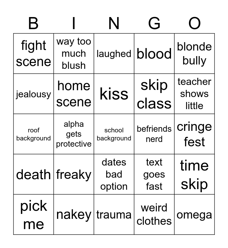 This bingo card has a free space and 24 words: freaky, nakey, kiss, pick me, blonde bully, fight scene, jealousy, way too much blush, befriends nerd, dates bad option, skip class, roof background, text goes fast, time skip, home scene, weird clothes, cringe fest, laughed, teacher shows little, alpha gets protective, omega, death, blood and trauma.