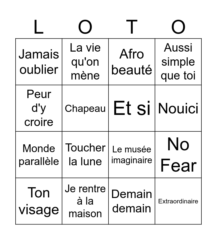 This bingo card has 16 words: Je rentre à la maison, No Fear, Afro beauté, Jamais oublier, Monde parallèle, La vie qu'on mène, Le musée imaginaire, Demain demain, Peur d'y croire, Chapeau, Ton visage, Aussi simple que toi, Toucher la lune, Nouici, Et si and Extraordinaire.