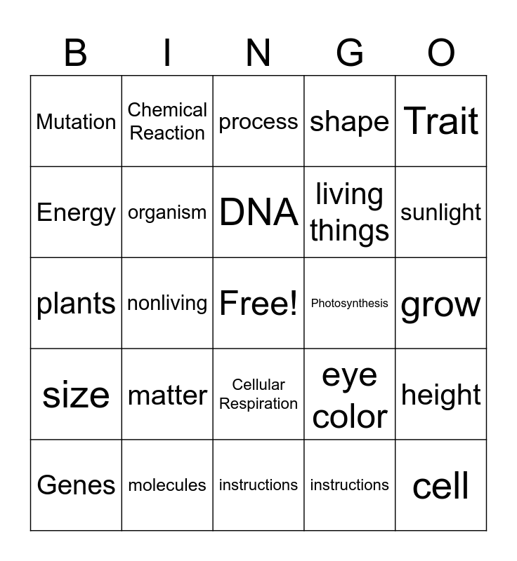 This bingo card has a free space and 24 words: matter, molecules, DNA, Genes, Trait, Mutation, Energy, Chemical Reaction, Photosynthesis, Cellular Respiration, living things, plants, eye color, height, organism, instructions, grow, process, sunlight, nonliving, cell, size, shape and instructions.