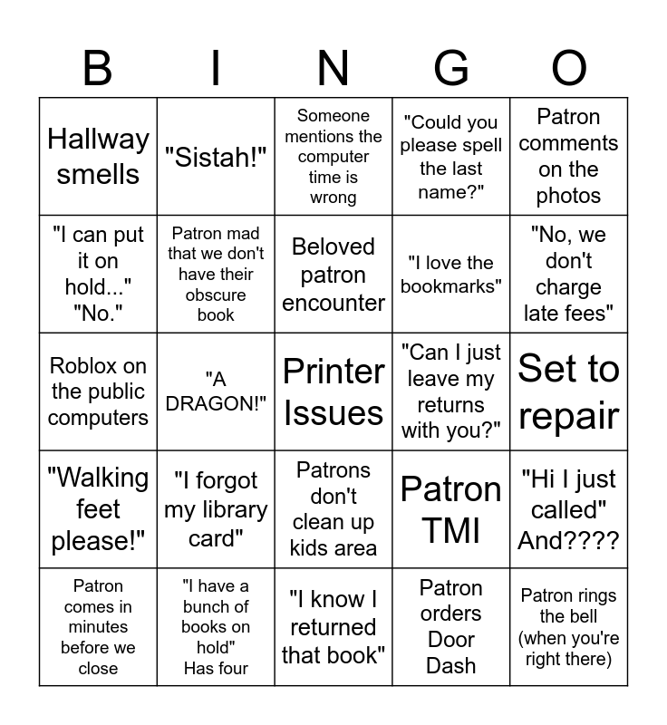 This bingo card has a free space and 48 words: Make/ renew library card, Patron rings the bell (when you're right there), Moldy book or unacceptable item donations, "I know I returned that book", "I forgot my library card", Audible music from headphones, "Sistah!", Strange noise, "I can put it on hold..." "No.", "What's the PIN again?", Patron mad that we don't have their obscure book, "Could you please spell the last name?", "Hi I just called" And????, Patron TMI, Farmer comes in with unreasonable printing request, Visit from our "neighbor girls", Beloved patron encounter, "Can I just leave my returns with you?", "Holds for (name)" "......Do you have your card?", Patron comments on the photos, "A DRAGON!", Patron orders Door Dash, Hallway smells, "I love the bookmarks", Patron leaves bag "Gotta fill 'er up", "No, we don't charge late fees", Patron comes in minutes before we close, "Can you help me find Frieda McFadden?", Patrons don't clean up kids area, "Walking feet please!", Patron takes shoes off, "I can see my holds on the shelf", Patron tries using public computer for catalog, Picking up books for relative, does not have card, "I have a bunch of books on hold" Has four, Someone says something genuinely kind, Ask child what they like to read about "I don't know", Set to repair, "How old do you have to be to get a library card?", "Where are the (specific genre) books?", "What's the check out limit?", "I just got the email that my holds were sent back, can you....", Someone mentions the computer time is wrong, "Working at the library must be quiet,easy, etc.", Roblox on the public computers, "Can you look up my checkout history?", "Can you extend my computer time?" and "Heard Chef"/ "Shuttup!".