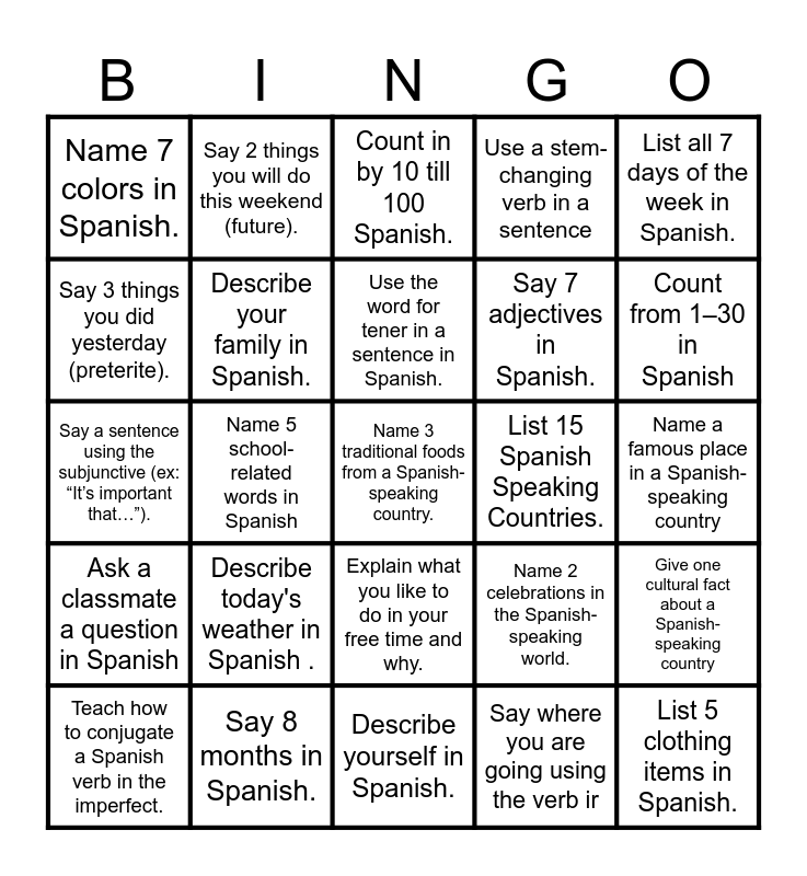 This bingo card has a free space and 24 words: Describe today's weather in Spanish ., Say 8 months in Spanish., Use the word for tener in a sentence in Spanish., Teach how to conjugate a Spanish verb in the imperfect., List all 7 days of the week in Spanish., Name 7 colors in Spanish., Say 3 things you did yesterday (preterite)., Say 2 things you will do this weekend (future)., List 15 Spanish Speaking Countries., Explain what you like to do in your free time and why., Say 7 adjectives in Spanish., Say a sentence using the subjunctive (ex: “It’s important that…”)., Name 2 celebrations in the Spanish-speaking world., Give one cultural fact about a Spanish-speaking country, Describe your family in Spanish., Say where you are going using the verb ir, Name a famous place in a Spanish-speaking country, Count in by 10 till 100 Spanish., Count from 1–30 in Spanish, Name 5 school-related words in Spanish, List 5 clothing items in Spanish., Ask a classmate a question in Spanish, Use a stem-changing verb in a sentence and Describe yourself in Spanish..