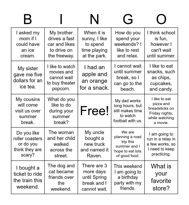 This bingo card has a free space and 24 words: The woman and her child walked across the street., The dog and cat became friends over the weekend., I had an apple and an orange for a snack., I bought a ticket to ride the train this weekend., I think school is fun, however I can't wait until summer., I asked my mom if I could have an ice cream., My sister gave me five dollars for an ice tea., My brother drives a fast car and likes to drive on the freeway., My dad works long hours, but still makes time to watch football with us., My uncle bought a new truck and named it Raven., I cannot wait until summer break, so I can go to the beach., My cousins will come visit us over summer break., We are planning a road trip this summer and I hope to eat lots of good food., I am going to run in a relay in a few works, so I need to keep practicing., I like to watch movies and cannot wait to buy theater popcorn., This weekend I am going to a birthday party with my friends., I like to eat pizza and breadsticks on Friday nights, while watching a movie., When it is sunny, I like to spend time playing at the park., I like to eat snacks, such as chips, cupcakes, and candy., What do you like to do during your summer break?, What is your favorite store?, Do you like roller coasters or do you think they are scary?, How do you spend your weekends? I like to rest and relax. and There are 3 more days until Spring break and I cannot wait..