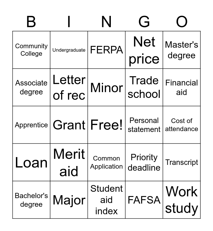 This bingo card has a free space and 24 words: Merit aid, Major, Minor, Bachelor's degree, Master's degree, Community College, Associate degree, Undergraduate, Personal statement, Common Application, Trade school, Apprentice, Priority deadline, Transcript, Letter of rec, FAFSA, Cost of attendance, FERPA, Financial aid, Grant, Work study, Loan, Net price and Student aid index.