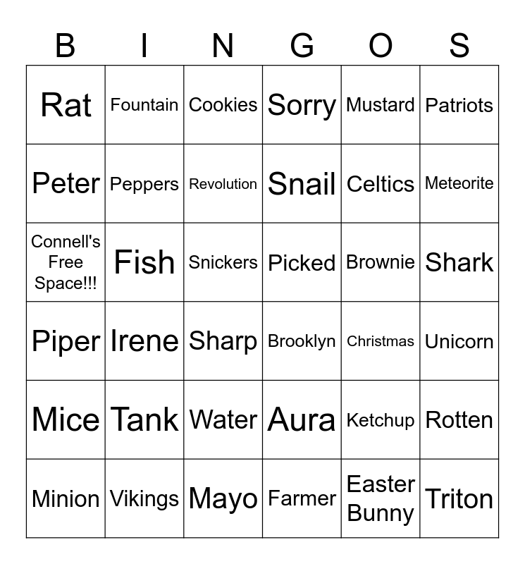 This bingo card has 36 words: Aura, Water, Farmer, Peter, Piper, Picked, Peppers, Mayo, Mustard, Ketchup, Meteorite, Sorry, Rotten, Fish, Snail, Rat, Mice, Brownie, Connell's Free Space!!!, Cookies, Snickers, Irene, Brooklyn, Sharp, Christmas, Fountain, Celtics, Vikings, Revolution, Patriots, Triton, Minion, Unicorn, Shark, Tank and Easter Bunny.