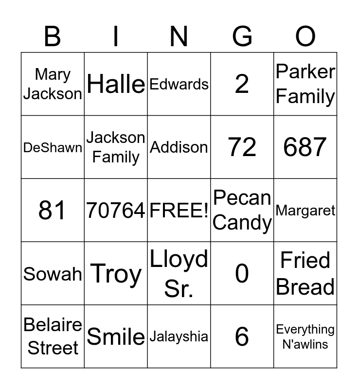 This bingo card has a free space and 25 words: Troy, Jalayshia, Addison, Belaire Street, Parker Family, Mary Jackson, DeShawn, Halle, Pecan Candy, Lloyd Sr., 72, 81, 0, Fried Bread, Jackson Family, Edward Sr., Margaret, Edwards, 687, 70764, Everything N'awlins, Smile, Sowah, 2 and 6.