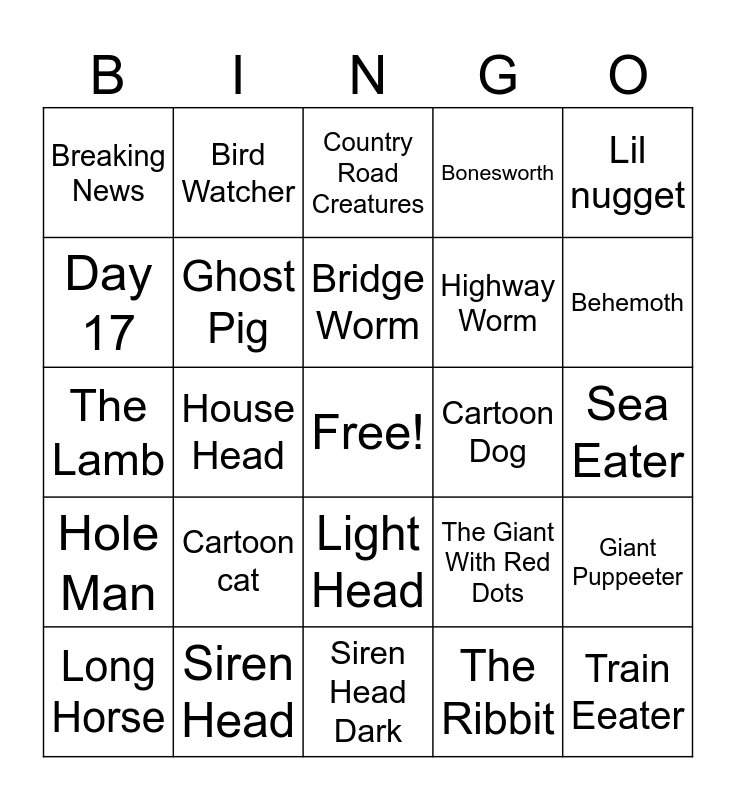 This bingo card has a free space and 24 words: Cartoon cat, Siren Head, Bridge Worm, Long Horse, Lil nugget, Breaking News, Day 17, Bird Watcher, Cartoon Dog, Light Head, Highway Worm, The Lamb, The Giant With Red Dots, Giant Puppeeter, Ghost Pig, The Ribbit, Sea Eater, Country Road Creatures, Behemoth, House Head, Train Eeater, Hole Man, Bonesworth and Siren Head Dark.
