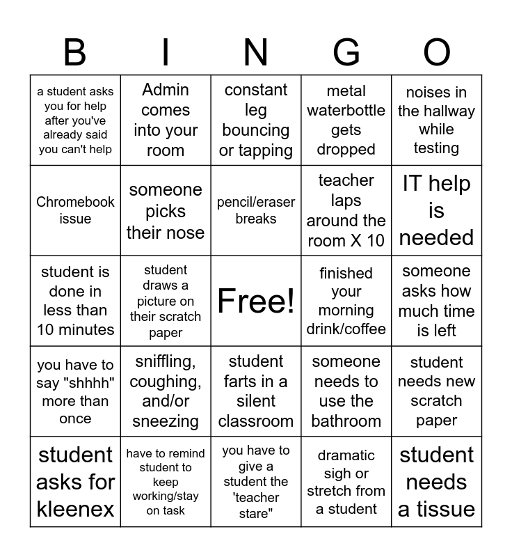 This bingo card has a free space and 24 words: sniffling, coughing, and/or sneezing, have to remind student to keep working/stay on task, pencil/eraser breaks, student asks for kleenex, noises in the hallway while testing, a student asks you for help after you've already said you can't help, Chromebook issue, Admin comes into your room, finished your morning drink/coffee, student farts in a silent classroom, teacher laps around the room X 10, student is done in less than 10 minutes, someone needs to use the bathroom, student needs new scratch paper, someone picks their nose, dramatic sigh or stretch from a student, someone asks how much time is left, constant leg bouncing or tapping, IT help is needed, student draws a picture on their scratch paper, student needs a tissue, you have to say "shhhh" more than once, metal waterbottle gets dropped and you have to give a student the 'teacher stare".