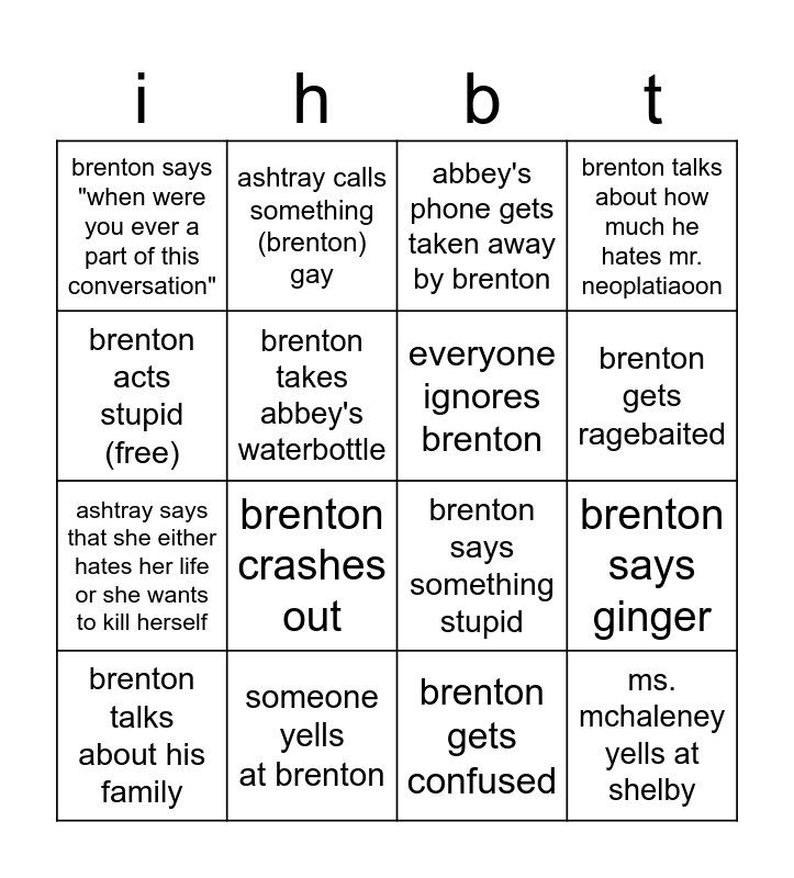 This bingo card has 16 words: someone yells at brenton, brenton says ginger, abbey's phone gets taken away by brenton, brenton says "when were you ever a part of this conversation", ashtray says that she either hates her life or she wants to kill herself, ashtray calls something (brenton) gay, brenton says something stupid, brenton gets confused, brenton acts stupid (free), brenton takes abbey's waterbottle, brenton talks about his family, brenton talks about how much he hates mr. neoplatiaoon, brenton crashes out, brenton gets ragebaited, everyone ignores brenton and ms. mchaleney yells at shelby.