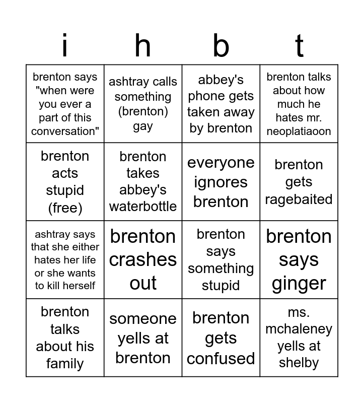 This bingo card has 16 words: someone yells at brenton, brenton says ginger, abbey's phone gets taken away by brenton, brenton says "when were you ever a part of this conversation", ashtray says that she either hates her life or she wants to kill herself, ashtray calls something (brenton) gay, brenton says something stupid, brenton gets confused, brenton acts stupid (free), brenton takes abbey's waterbottle, brenton talks about his family, brenton talks about how much he hates mr. neoplatiaoon, brenton crashes out, brenton gets ragebaited, everyone ignores brenton and ms. mchaleney yells at shelby.