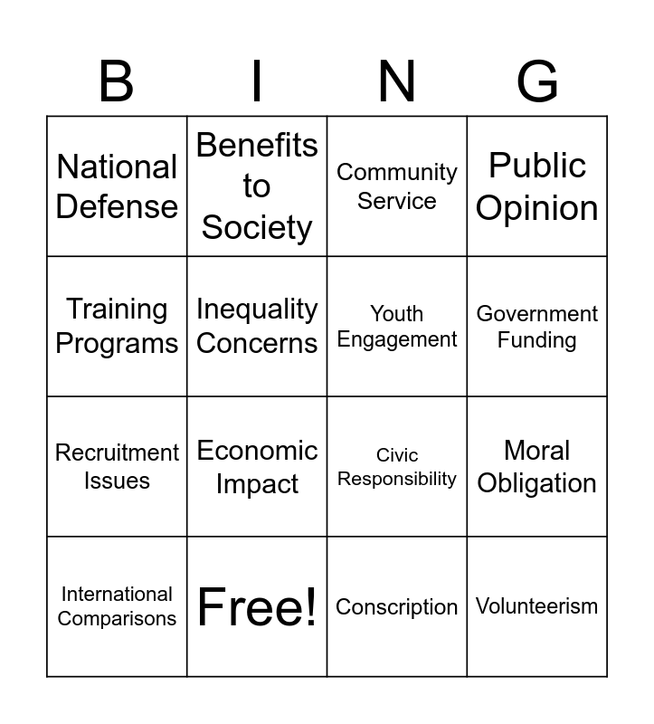 This bingo card has 21 words: Free!, Mandatory Service, Benefits to Society, Personal Choice, Conscription, Youth Engagement, National Defense, Community Service, Civic Responsibility, Government Funding, Recruitment Issues, Public Opinion, Volunteerism, Life Skills, Inequality Concerns, Political Views, International Comparisons, Economic Impact, Training Programs, Moral Obligation and Freedom of Choice.