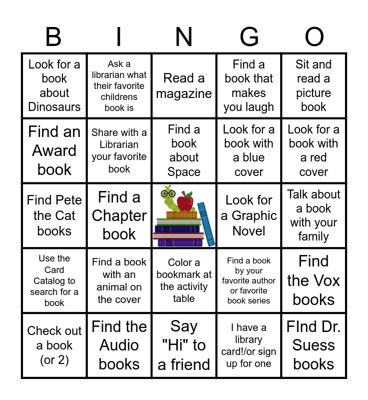 This bingo card has a free space and 24 words: Find a book with an animal on the cover, Find the Audio books, Find a book about Space, Check out a book (or 2), Sit and read a picture book, Look for a book about Dinosaurs, Find an Award book, Ask a librarian what their favorite childrens book is, Look for a Graphic Novel, Color a bookmark at the activity table, Look for a book with a blue cover, Find Pete the Cat books, Find a book by your favorite author or favorite book series, Find the Vox books, Share with a Librarian your favorite book, I have a library card!/or sign up for one, Talk about a book with your family, Read a magazine, Look for a book with a red cover, Find a Chapter book, FInd Dr. Suess books, Use the Card Catalog to search for a book, Find a book that makes you laugh and Say "Hi" to a friend.