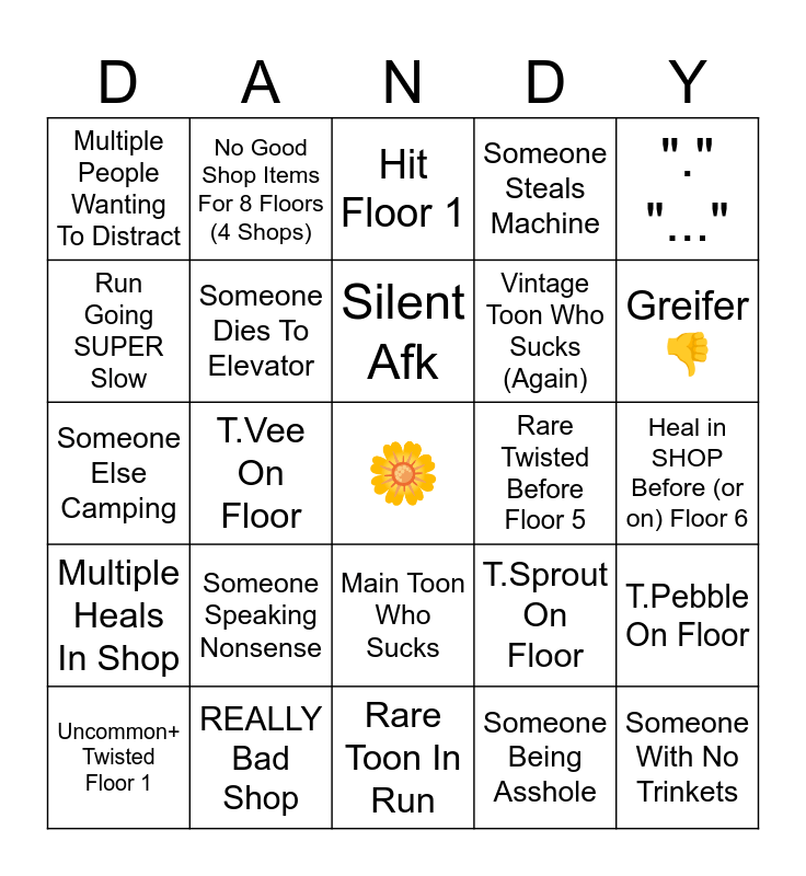 This bingo card has a free space and 79 words: Someone Missing Skillchecks, Abysmal Trinkets, Hit Floor 1, Death Before Floor 5, More Than 2 People Dead Before Floor 10, Make It To Floor 10, Make It To Floor 15, Make It To Floor 20!, Make It To Floor 5.., Someone Silently Leaves, Someone Leaves Before Game Starts, Someone Takes Ages To "Ready Up", Someone Steals Machine, Multiple People Wanting To Distract, Someone Doing Little/No Machines, Run Going SUPER Slow, Arguing, Someone Speaking Nonsense, Heal On FLOOR Before Floor 5 (Shop not included), Heal in SHOP Before (or on) Floor 6, "Who Distract?", "." "...", Someone Else Camping, Silent Afk, Someone Dies To Elevator, Someone Dies To No Stamina, Someone Taking All Good Items, Someone Stealing Tapes (If sprout), Someone Taking Heals (If healer), Vintage Toon Who Sucks, Greifer 👎, Main Toon In Run, Rare Toon In Run, Uncommon Toon In Run, Uncommon+ Twisted Floor 1, Rare Twisted Before Floor 5, Main Before Floor 10, Double Main Before Floor 20, Someone With 1 Trinket Equipped, Someone With No Trinkets, (Assumedly) Starter In Run, "Goated Team" (Or variation), Free Floor, Rodger Opened, RND Activated, No Good Shop Items For 8 Floors (4 Shops), Blackout Before Floor 10, Multiple Blackouts Before Floor 15, OMG STOP WITH THE BLACKOUTS (5+ blackouts 1 run), Run Dead Before Floor 10, T.Pebble On Floor, T.Vee On Floor, T.Sprout On Floor, T.Astro On Floor, T.Shelly On Floor, T.Dandy On Floor, "What Run", "Who" "Who Died", Talking To/At Dandy, Main Toon Who Sucks, Vintage Toon Who Sucks (Again), Trying To Manifest Main Twisted, Ranged Twisted, Yelling A Twisteds Name That's On Floor Ex: "GOOB", Voting Stupid Cards, Someone Voting A Card No One Agrees With, Active Ability Being Used Stupidly (Or not at all.), Heal Card Spawn, Double Card Spawn, Multiple Heals In Shop, REALLY Bad Shop, Gumballs In Shop, Bandaid In Shop, Gamble Card Spawn, Dyle Card Spawn, Someone Being Asshole, Flutter In Run., astro in run and stupe vee in run.