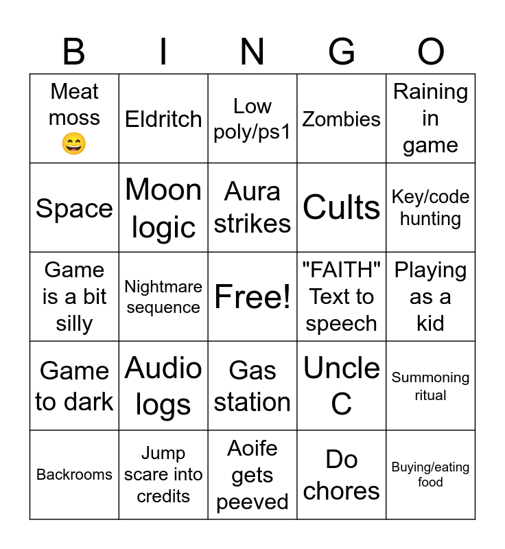 This bingo card has a free space and 26 words: Gas station, Do chores, Aura strikes, Jump scare into credits, Raining in game, Meat moss 😄, Space, Eldritch, Playing as a kid, Uncle C, Cults, Game is a bit silly, Summoning ritual, Backrooms, Nightmare sequence, "Spot the anomaly", Zombies, Game to dark, Low poly/ps1, Buying/eating food, Key/code hunting, Aoife gets peeved, "FAITH" Text to speech, Audio logs, Moon logic and Game wasn't really horror.