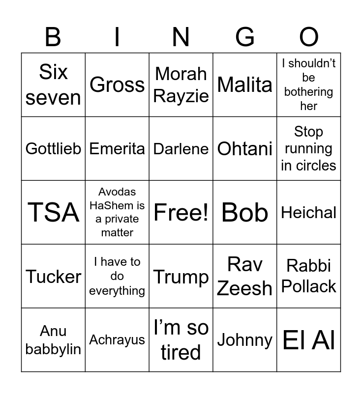 This bingo card has a free space and 46 words: Rabbi Lehrfield, El Al, Chicken soup, I’m so tired, I have to do everything, You’re so annoying, Gross, Surkis, Gottlieb, Bubbie and Zaydie’s Leibowitz, Emerita, Malita, Rabbi Pollack, Rav Zeesh, YZP of P in SI, Renee, Darlene, Bob, Yelloz, I shouldn’t be bothering her, Avodas HaShem is a private matter, Johnny, Six seven, Ohtani, Mookie Betts, Stop running in circles, Anu babbylin, Bibi, Trump, Tucker, Eden Gardens, Houston, Maryanne, I’m so full, Reenas, Achrayus, Heichal, Moshiach, Mrs. Kellerman, Rabbi Goldstein, Toners, Morah Rayzie, TSA, ICE, Baby Moshe and So help you.