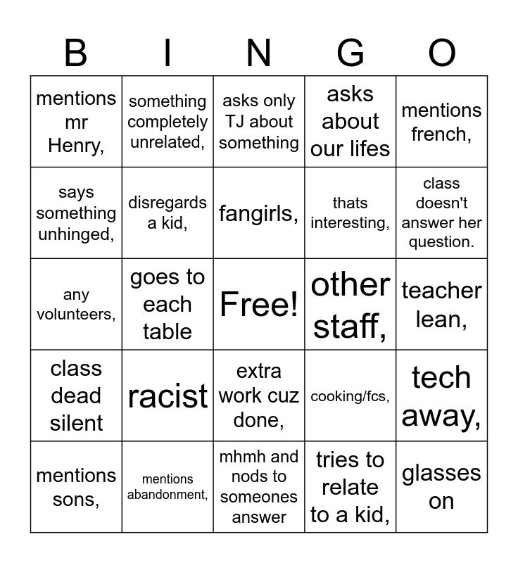 This bingo card has a free space and 24 words: racist, mentions abandonment,, fangirls,, mentions sons,, mentions french,, mentions mr Henry,, says something unhinged,, something completely unrelated,, other staff,, extra work cuz done,, thats interesting,, any volunteers,, cooking/fcs,, tech away,, disregards a kid,, tries to relate to a kid,, teacher lean,, asks only TJ about something, class doesn't answer her question., goes to each table, glasses on, class dead silent, asks about our lifes and mhmh and nods to someones answer.