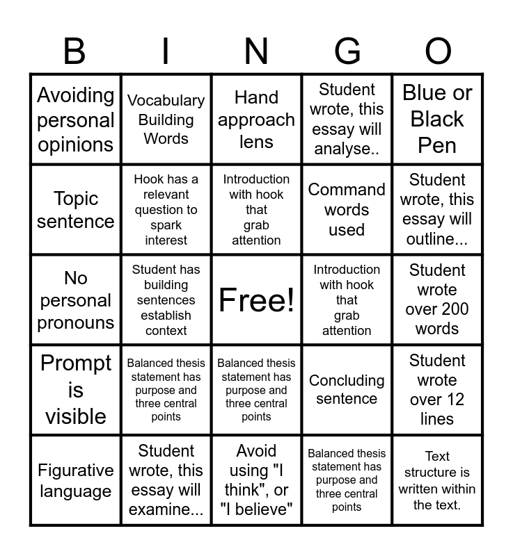 This bingo card has a free space and 24 words: Balanced thesis statement has purpose and three central points, Student wrote, this essay will examine..., Introduction with hook that grab attention, Figurative language, Blue or Black Pen, Avoiding personal opinions, Topic sentence, Vocabulary Building Words, Introduction with hook that grab attention, Balanced thesis statement has purpose and three central points, Command words used, No personal pronouns, Concluding sentence, Student wrote over 12 lines, Hook has a relevant question to spark interest, Balanced thesis statement has purpose and three central points, Student wrote over 200 words, Hand approach lens, Student wrote, this essay will outline..., Student has building sentences establish context, Text structure is written within the text., Prompt is visible, Student wrote, this essay will analyse.. and Avoid using "I think", or "I believe".