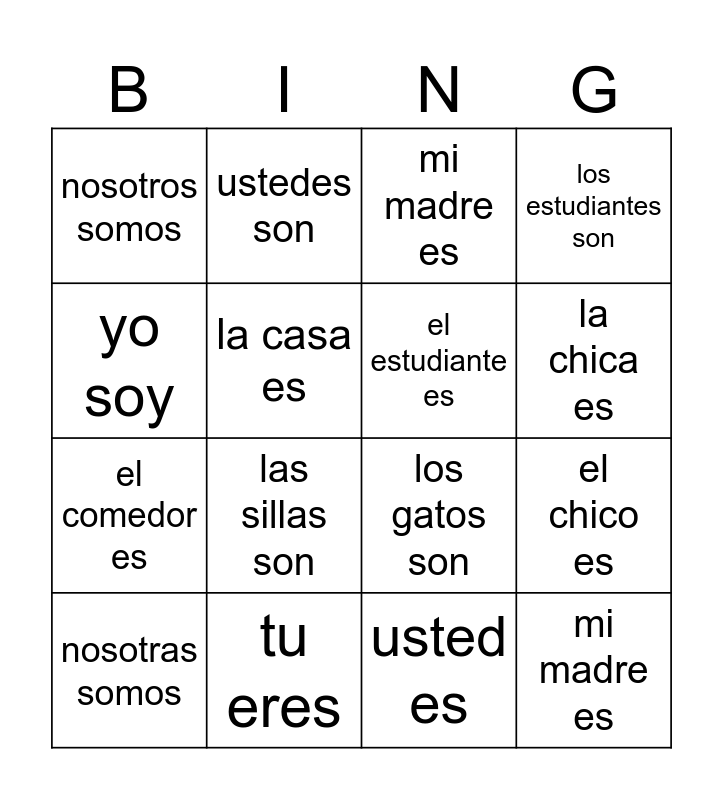 This bingo card has 16 words: tu eres, el chico es, mi madre es, nosotros somos, el comedor es, ustedes son, los gatos son, usted es, yo soy, la casa es, nosotras somos, los estudiantes son, las sillas son, la chica es, el estudiante es and mi madre es.