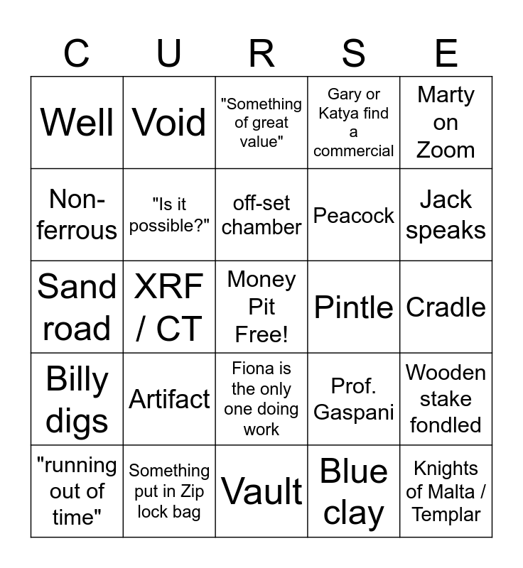 This bingo card has a free space and 24 words: Artifact, Something put in Zip lock bag, off-set chamber, "running out of time", Marty on Zoom, Well, Non-ferrous, Void, Pintle, Fiona is the only one doing work, Peacock, Sand road, Prof. Gaspani, Wooden stake fondled, "Is it possible?", Blue clay, Cradle, "Something of great value", Jack speaks, XRF / CT, Knights of Malta / Templar, Billy digs, Gary or Katya find a commercial and Vault.