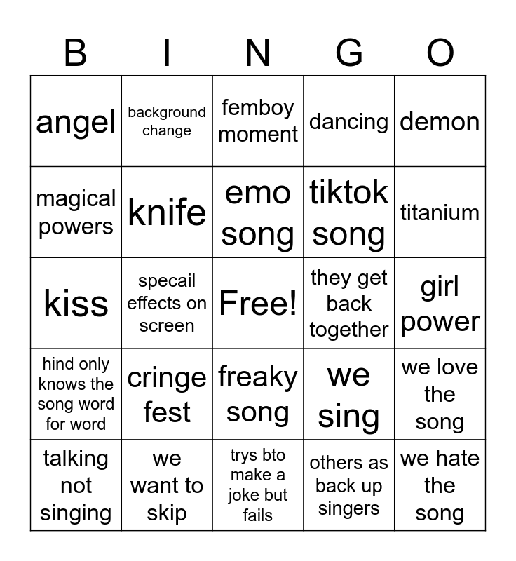 This bingo card has a free space and 24 words: cringe fest, we want to skip, emo song, talking not singing, demon, angel, magical powers, background change, they get back together, freaky song, tiktok song, kiss, we sing, we love the song, knife, others as back up singers, girl power, femboy moment, titanium, specail effects on screen, we hate the song, hind only knows the song word for word, dancing and trys bto make a joke but fails.