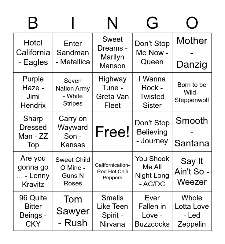 This bingo card has a free space and 51 words: Killing in the Name of - Rage against the Machine, Whole Lotta Love - Led Zeppelin, Black Dog - Led Zeppelin, Smells Like Teen Spirit - Nirvana, Sweet Child O Mine - Guns N Roses, Back in Black - AC/DC, Enter Sandman - Metallica, Money for Nothing - Dire Straits, Purple Haze - Jimi Hendrix, Bang on a Gong - T Rex, Seven Nation Army - White Stripes, Don't Stop Me Now - Queen, Say It Ain't So - Weezer, You Shook Me All Night Long - AC/DC, All Right Now - Free, Under the Bridge - Red Hot Chili Peppers, Highway Tune - Greta Van Fleet, Don't Stop Believing - Journey, Interstate Love Song - Stone Temple Pilots, Mother - Danzig, Carry on Wayward Son - Kansas, Ever Fallen in Love - Buzzcocks, Hotel California - Eagles, I Wanna Rock - Twisted Sister, The Kids Aren't Alright - Offspring, Eye of the Tiger - Survivor, Born to be Wild - Steppenwolf, A-Punk - Vampire Weekend, 96 Quite Bitter Beings - CKY, Sweet Dreams - Marilyn Manson, Dust in the Wind - Kansas, Seek & Destroy - Metallica, Oh Pretty Woman - Roy Orbison, Thunderstruck - AC/DC, Hey Joe - Jimi Hendrix, Tom Sawyer - Rush, Just Like Heaven - The Cure, Master of Puppets - Metallica, Sweet Home Alabama - Lynyrd Skynyrd, Crazy Train - Ozzy Osbourne, Smooth - Santana, Are you gonna go ... - Lenny Kravitz, One - Metallica, Welcome Home - Coheed and Cambria, Satisfaction - Rolling Stones, Symphony of Destruction - Megadeth, Sharp Dressed Man - ZZ Top, La Bamba - Richie Valens, Fortunate Son - CCR, Californication- Red Hot Chili Peppers and Jump - Van Halen.