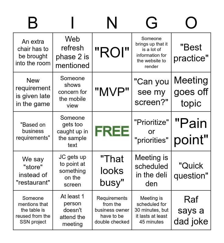 This bingo card has a free space and 24 words: JC gets up to point at something on the screen, At least 1 person doesn't attend the meeting, "MVP", Someone mentions that the table is reused from the SSN project, "Best practice", An extra chair has to be brought into the room, New requirement is given late in the game, Web refresh phase 2 is mentioned, "Prioritize" or "priorities", "That looks busy", "Can you see my screen?", "Based on business requirements", Meeting is scheduled in the deli den, "Quick question", Someone shows concern for the mobile view, Meeting is scheduled for 30 minutes, but it lasts at least 45 minutes, "Pain point", "ROI", Meeting goes off topic, Someone gets too caught up in the sample text, Raf says a dad joke, We say "store" instead of "restaurant", Someone brings up that it is a lot of information for the website to render and Requirements from the business owner have to be double checked.