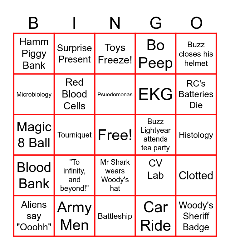 This bingo card has a free space and 44 words: Pixar Ball, Woody's Sheriff Badge, "Andy's Coming", Aliens say "Ooohh", Pizza Planet Truck, Car Ride, Toys Freeze!, "There's a snake in my boot", Buzz closes his helmet, Army Men, Bo Peep, Buzz Lightyear attends tea party, Mr Shark wears Woody's hat, "To infinity, and beyond!", Slinky Dog gets used as a bridge, Battleship, Buzz "flies", Magic 8 Ball, Barrel of Monkeys, RC's Batteries Die, Surprise Present, Mr. Potato Head's parts fall out, "You are a child's play thing!", Hamm Piggy Bank, Chemistry, Histology, Hematology, Satellite Labs, CV Lab, Blood Bank, Diagnosis, Clotted, Hemolysis, Incubation, Tourniquet, Aliquot, McWane Lab, Special Lab Services, Psuedomonas, Microbiology, EKG, Type and Screen, Red Blood Cells and White Blood Cells.