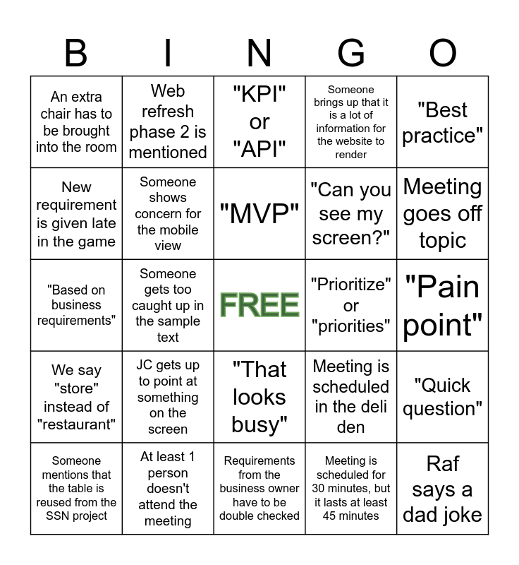 This bingo card has a free space and 24 words: JC gets up to point at something on the screen, At least 1 person doesn't attend the meeting, "MVP", Someone mentions that the table is reused from the SSN project, "Best practice", An extra chair has to be brought into the room, New requirement is given late in the game, Web refresh phase 2 is mentioned, "Prioritize" or "priorities", "That looks busy", "Can you see my screen?", "Based on business requirements", Meeting is scheduled in the deli den, "Quick question", Someone shows concern for the mobile view, Meeting is scheduled for 30 minutes, but it lasts at least 45 minutes, "Pain point", "KPI" or "API", Meeting goes off topic, Someone gets too caught up in the sample text, Raf says a dad joke, We say "store" instead of "restaurant", Someone brings up that it is a lot of information for the website to render and Requirements from the business owner have to be double checked.