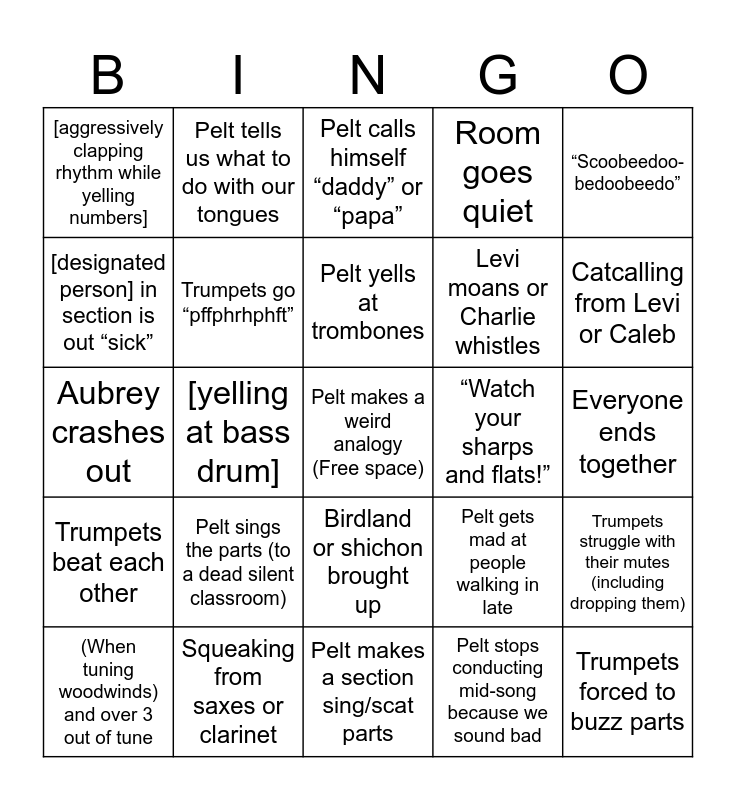 This bingo card has a free space and 34 words: Percussion breaks something, Pelt stops conducting mid-song because we sound bad, Flutes forget how to count, Percussion drops a stick, Trumpets beat each other, Trumpets go “pffphrhphft”, “Scoobeedoo-bedoobeedo”, (When tuning woodwinds) and over 3 out of tune, Pelt tells us what to do with our tongues, “You’re not too good to mark it”, Pelt yells at trombones, Pelt calls himself “daddy” or “papa”, Trumpets play piano/pianissimo, Pelt yells at the flutes about how they’re breathing wrong, “Watch your sharps and flats!”, Catcalling from Levi or Caleb, Squeaking from saxes or clarinet, Aubrey crashes out, Pelt sings the parts (to a dead silent classroom), Pelt gets mad at people walking in late, Birdland or shichon brought up, Pelt tells the guys why they don’t have a girlfriend, [aggressively clapping rhythm while yelling numbers], Everyone ends together, Pelt makes a section sing/scat parts, Trumpets forced to buzz parts, Room goes quiet, Bb major scale unsaturated (warm-up), Levi moans or Charlie whistles, [designated person] in section is out “sick”, Trumpets discuss drinking blue juice, [yelling at bass drum], Trumpets struggle with their mutes (including dropping them) and “It’s that easy!”.