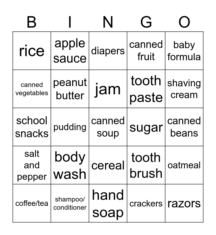 This bingo card has 35 words: kraft dinner, pasta, pasta sauce, peanut butter, cereal, canned fruit, canned vegetables, juice boxes, jam, cake mix, school snacks, baby formula, canned fish, canned meat, rice, sugar, crackers, pudding, salt and pepper, canned soup, tooth brush, coffee/tea, oatmeal, shampoo/ conditioner, diapers, shaving cream, razors, oil, tooth paste, canned beans, dried fruit, hand soap, body wash, apple sauce and coffee/tea.