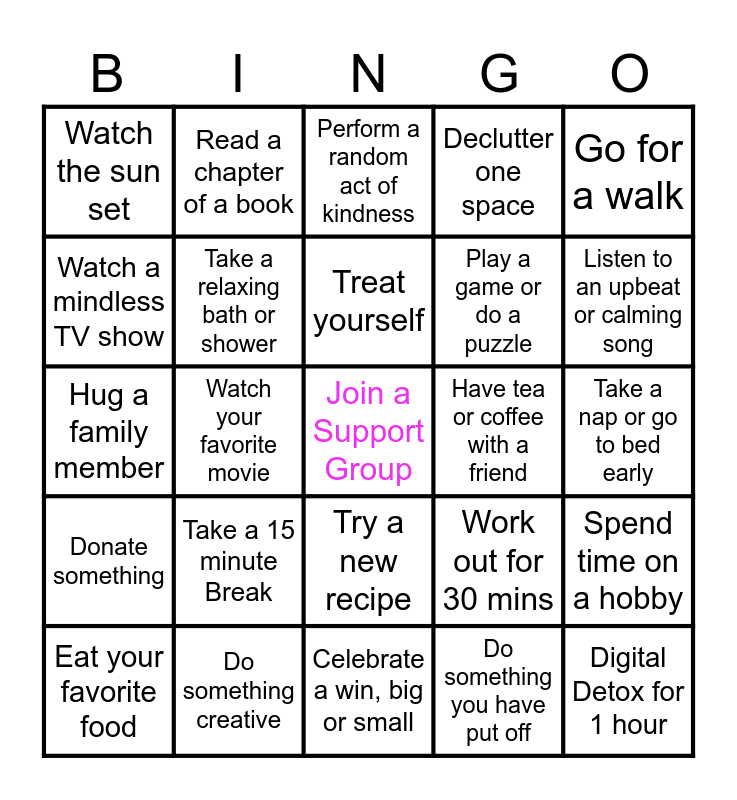 This bingo card has a free space and 24 words: Take a 15 minute Break, Do something creative, Treat yourself, Eat your favorite food, Go for a walk, Watch the sun set, Watch a mindless TV show, Read a chapter of a book, Have tea or coffee with a friend, Try a new recipe, Play a game or do a puzzle, Hug a family member, Work out for 30 mins, Spend time on a hobby, Take a relaxing bath or shower, Do something you have put off, Take a nap or go to bed early, Perform a random act of kindness, Listen to an upbeat or calming song, Watch your favorite movie, Digital Detox for 1 hour, Donate something, Declutter one space and Celebrate a win, big or small.