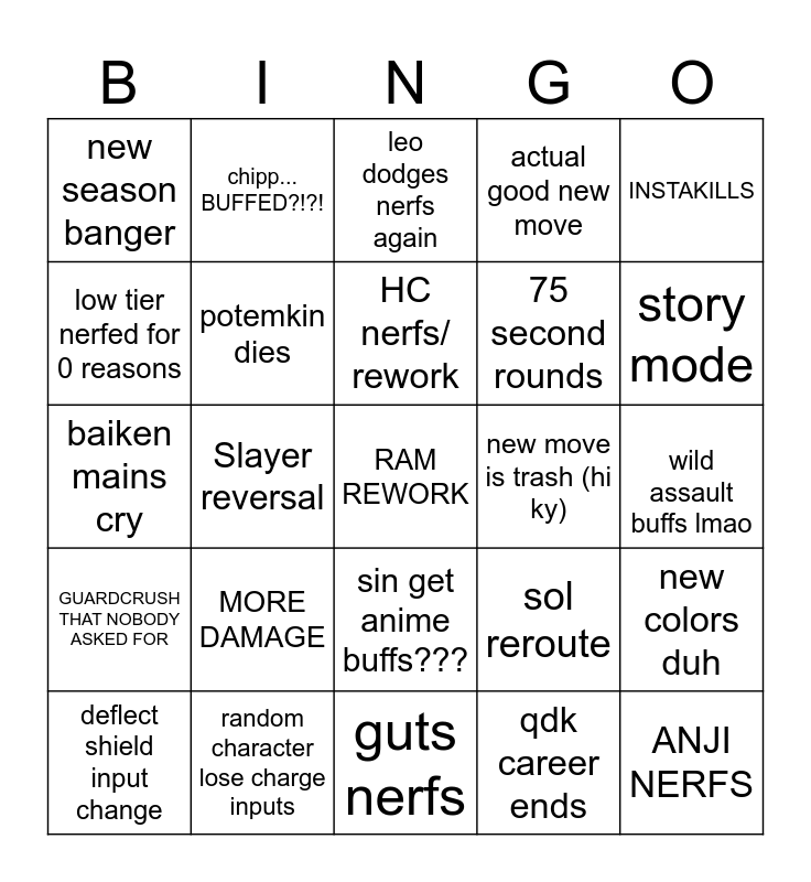 This bingo card has a free space and 24 words: MORE DAMAGE, random character lose charge inputs, HC nerfs/ rework, deflect shield input change, INSTAKILLS, new season banger, low tier nerfed for 0 reasons, chipp... BUFFED?!?!, new move is trash (hi ky), sin get anime buffs???, 75 second rounds, baiken mains cry, sol reroute, new colors duh, potemkin dies, qdk career ends, wild assault buffs lmao, leo dodges nerfs again, story mode, Slayer reversal, ANJI NERFS, GUARDCRUSH THAT NOBODY ASKED FOR, actual good new move and guts nerfs.
