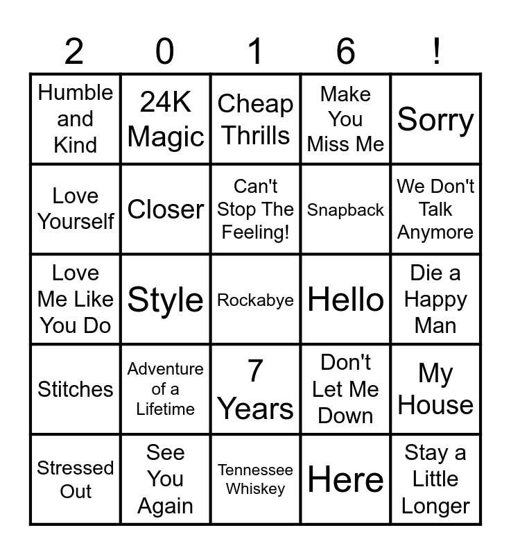 This bingo card has a free space and 33 words: One Dance, Let me Love You, Style, Hide Away, Stitches, Closer, Sorry, Stressed Out, 24K Magic, This is What You Came For, Can't Stop The Feeling!, Cheap Thrills, Starving, Into You, Hello, We Don't Talk Anymore, See You Again, Love Me Like You Do, Adventure of a Lifetime, Don't Let Me Down, 7 Years, Can't Feel My Face, Humble and Kind, Die a Happy Man, Tennessee Whiskey, Stay a Little Longer, Make You Miss Me, Snapback, Love Yourself, My House, Just Like Fire, Here and Dancing On My Own.