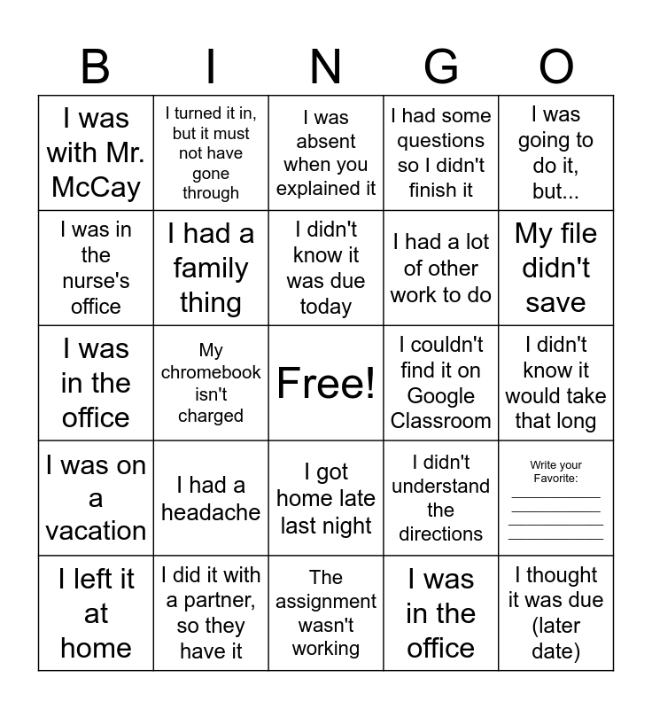 This bingo card has a free space and 34 words: My Chromebook isn't working, I was in the office, My internet wasn't working, I was sick, I was on a vacation, I had a family thing, I was going to do it, but..., I left it at home, I turned it in, but it must not have gone through, My friends said I didn't have to do it, I didn't know it was due today, I was absent when you explained it, I ran out of time, I did it, but I lost it, I couldn't find it on Google Classroom, My file didn't save, I did it with a partner, so they have it, I was in the office, I had a headache, I didn't understand the directions, I got home late last night, I completed it, I just need to turn it in, I was with Mr. McCay, I didn't know it would take that long, The assignment wasn't working, I thought it was due (later date), I had some questions so I didn't finish it, I am/was tired, I had a lot of other work to do, I was in the nurse's office, I didn't know we had to do that, My chromebook isn't charged, Write your Favorite: ______________ ______________ _______________ _______________ and It was my friends fault.