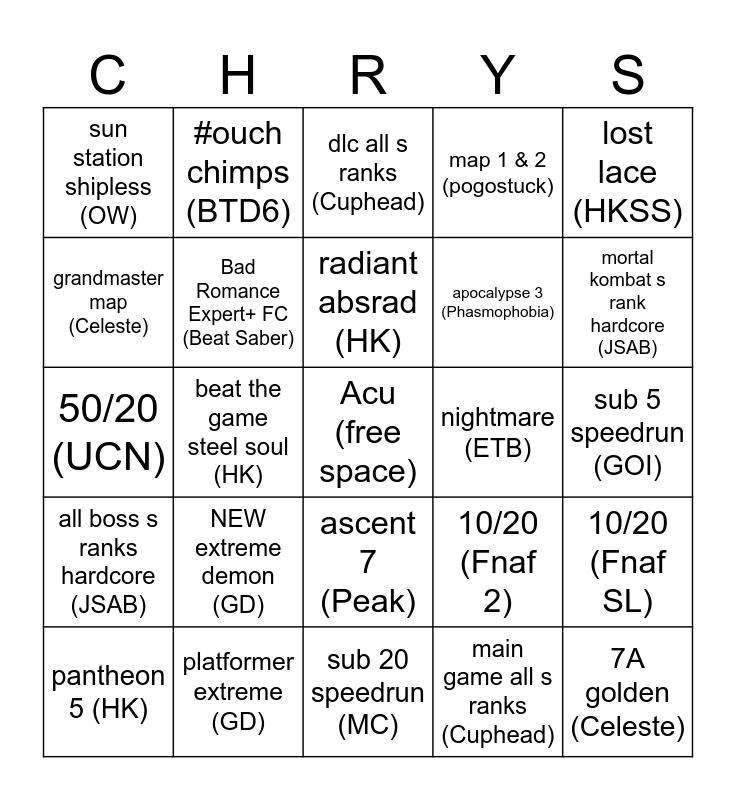 This bingo card has a free space and 24 words: NEW extreme demon (GD), platformer extreme (GD), radiant absrad (HK), pantheon 5 (HK), lost lace (HKSS), sun station shipless (OW), grandmaster map (Celeste), #ouch chimps (BTD6), nightmare (ETB), ascent 7 (Peak), apocalypse 3 (Phasmophobia), 50/20 (UCN), 10/20 (Fnaf 2), 10/20 (Fnaf SL), Bad Romance Expert+ FC (Beat Saber), main game all s ranks (Cuphead), sub 5 speedrun (GOI), dlc all s ranks (Cuphead), mortal kombat s rank hardcore (JSAB), beat the game steel soul (HK), 7A golden (Celeste), all boss s ranks hardcore (JSAB), map 1 & 2 (pogostuck) and sub 20 speedrun (MC).