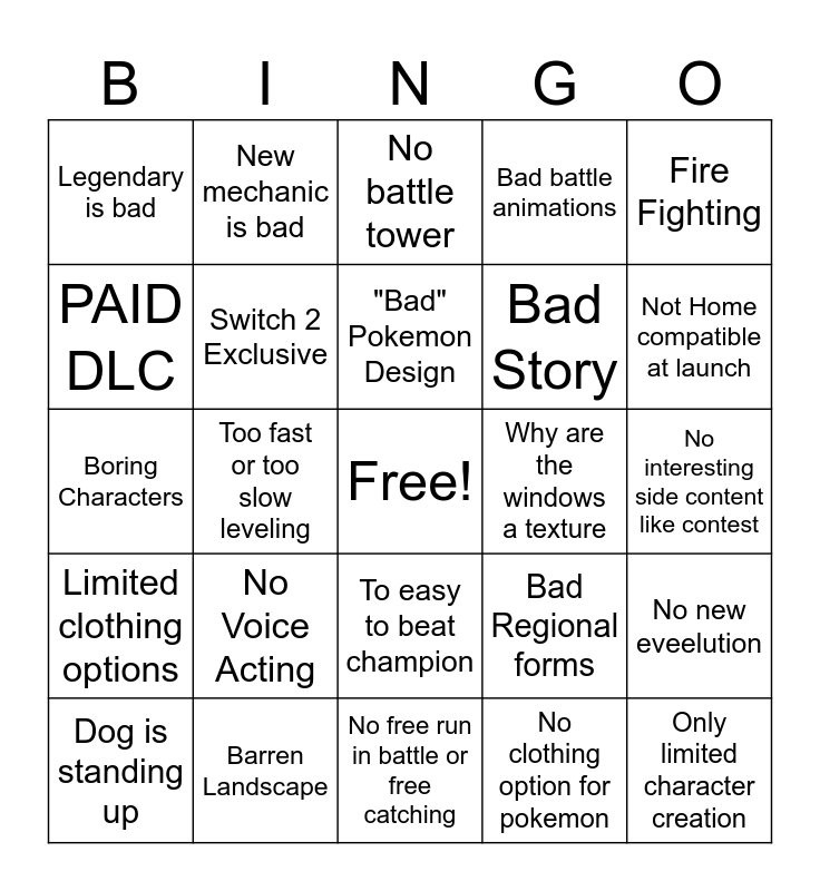 This bingo card has a free space and 24 words: No Voice Acting, Barren Landscape, "Bad" Pokemon Design, Dog is standing up, Fire Fighting, Legendary is bad, PAID DLC, New mechanic is bad, Why are the windows a texture, To easy to beat champion, Bad Story, Boring Characters, Bad Regional forms, No new eveelution, Switch 2 Exclusive, No clothing option for pokemon, No interesting side content like contest, No battle tower, Not Home compatible at launch, Too fast or too slow leveling, Only limited character creation, Limited clothing options, Bad battle animations and No free run in battle or free catching.