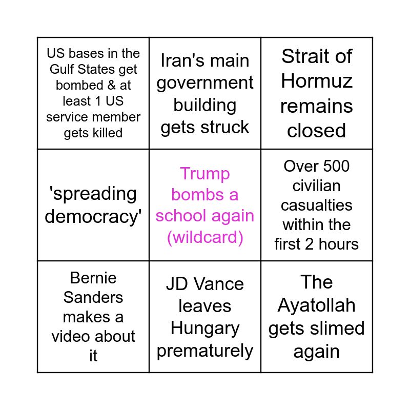 This bingo card has a free space and 8 words: Over 500 civilian casualties within the first 2 hours, Strait of Hormuz remains closed, Iran's main government building gets struck, Bernie Sanders makes a video about it, US bases in the Gulf States get bombed & at least 1 US service member gets killed, The Ayatollah gets slimed again, 'spreading democracy' and JD Vance leaves Hungary prematurely.