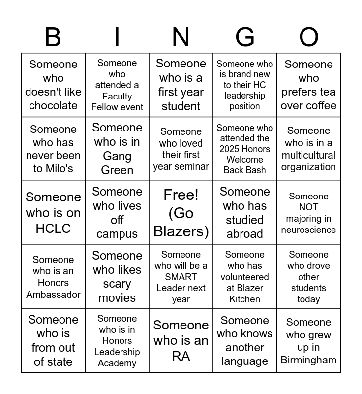 This bingo card has a free space and 29 words: Someone who is from out of state, Someone who is an SLC, Someone who lives off campus, Someone who is involved in research, Someone who doesn't like chocolate, Someone who is a first year student, Someone who is in Gang Green, Someone who likes scary movies, Someone who has studied abroad, Someone who is in Honors Leadership Academy, Someone NOT majoring in neuroscience, Someone who grew up in Birmingham, Someone who is an RA, Someone who knows another language, Someone who is in a multicultural organization, Someone who has been to Sidewalk Cinema, Someone who will be a SMART Leader next year, Someone who is an Honors Ambassador, Someone who prefers tea over coffee, Someone who is on HCLC, Someone who has volunteered at Blazer Kitchen, Someone who has Sarah as their advisor, Someone who attended the 2025 Honors Welcome Back Bash, Someone who has never been to Milo's, Someone who is brand new to their HC leadership position, Someone who attended a Faculty Fellow event, Someone who drove other students today, Someone who loved their first year seminar and Someone who takes classes at the Rec Center.