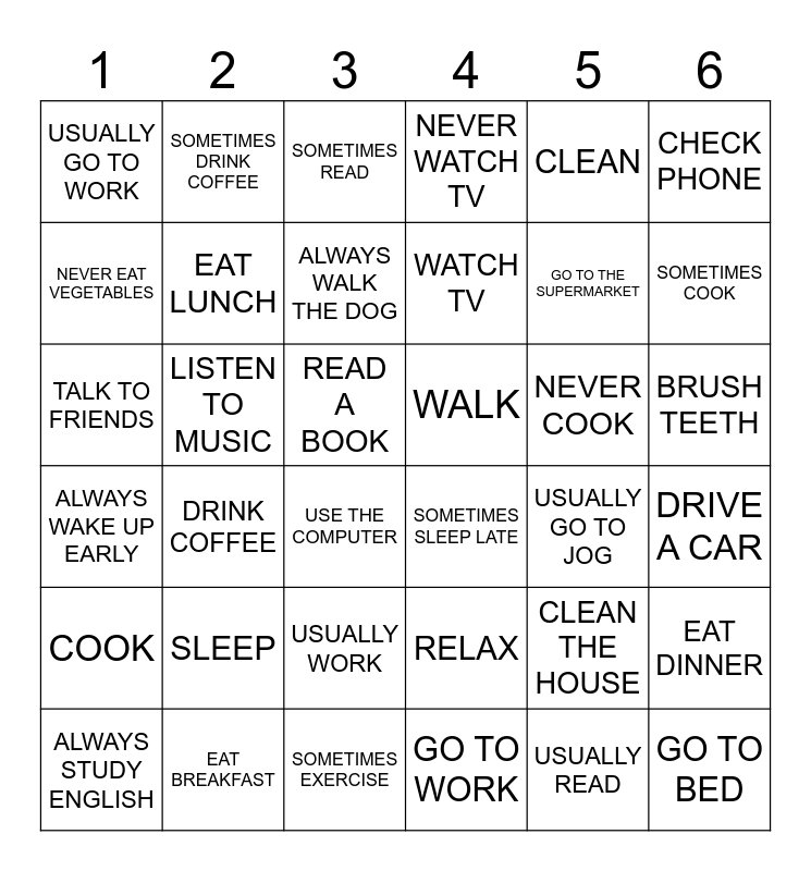 This bingo card has 36 words: ALWAYS WAKE UP EARLY, DRINK COFFEE, SOMETIMES EXERCISE, WATCH TV, NEVER COOK, BRUSH TEETH, USUALLY GO TO WORK, EAT BREAKFAST, SOMETIMES READ, RELAX, GO TO THE SUPERMARKET, CHECK PHONE, COOK, LISTEN TO MUSIC, ALWAYS WALK THE DOG, NEVER WATCH TV, CLEAN THE HOUSE, DRIVE A CAR, NEVER EAT VEGETABLES, EAT LUNCH, USE THE COMPUTER, SOMETIMES SLEEP LATE, USUALLY GO TO JOG, EAT DINNER, TALK TO FRIENDS, SOMETIMES DRINK COFFEE, READ A BOOK, GO TO WORK, CLEAN, SOMETIMES COOK, ALWAYS STUDY ENGLISH, SLEEP, USUALLY WORK, WALK, USUALLY READ and GO TO BED.