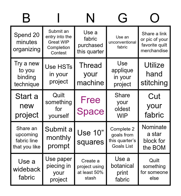 This bingo card has a free space and 28 words: Nominate a star block for the BOM, Share a recent quilt supply purchase, Use applique in your project, Use a botanical print fabric, Try a new to you binding technique, Use a fabric purchased this quarter, Submit an entry into the Great WIP Completion Contest, Share an upcoming fabric line that you like, Share your oldest WIP, Use a wideback fabric, Start a new project, Use an unconventional fabric, Use paper piecing in your project, Create a project using at least 50% stash, Utilize hand stitching, Create a project that is not a standard quilt, Submit a monthly prompt, Use HSTs in your project, Thread your machine, Use 10” squares, Spend 20 minutes organizing, Use black or white fabric, Quilt something for someone else, Quilt something for yourself, Cut your fabric, Complete 2 goals from this quarter’s Goals List, Share a link or pic of your favorite quilt merchandise and Use a fabric that has at least 4 different colors.