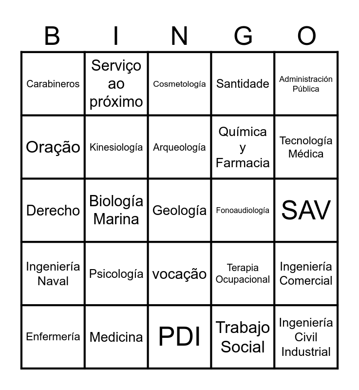 This bingo card has a free space and 29 words: Ingeniería en Construcción, Medicina, Cosmetología, Pedagogía, Administración Pública, Carabineros, Kinesiología, Arqueología, Fonoaudiología, Ingeniería Comercial, Enfermería, Biología Marina, Trabajo Social, Ingeniería Civil Industrial, Derecho, Administración de Empresas, PDI, Terapia Ocupacional, Tecnología Médica, Ingeniería Naval, Psicología, Odontología, Química y Farmacia, SAV, Oração, Serviço ao próximo, vocação, Santidade and sacerdote.