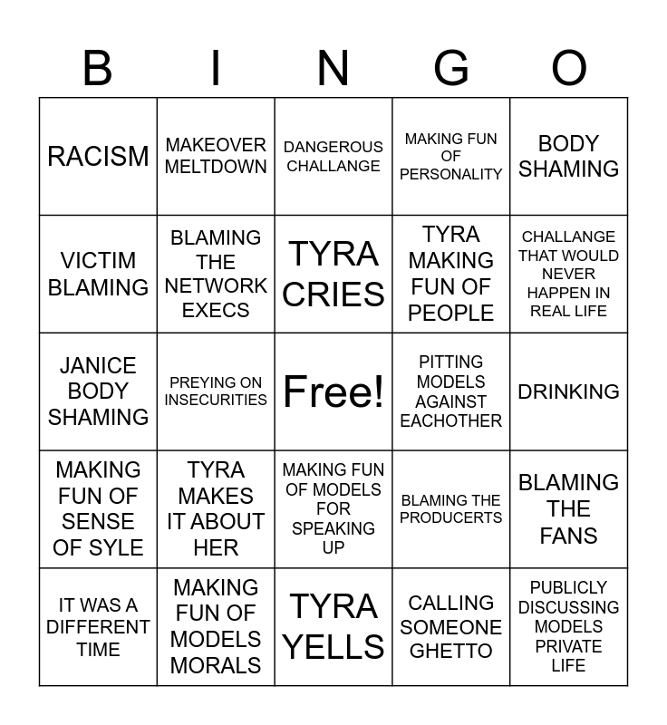 This bingo card has a free space and 25 words: TYRA MAKES IT ABOUT HER, TYRA YELLS, TYRA CRIES, IT WAS A DIFFERENT TIME, BODY SHAMING, RACISM, VICTIM BLAMING, MAKEOVER MELTDOWN, PITTING MODELS AGAINST EACHOTHER, MAKING FUN OF MODELS FOR SPEAKING UP, TYRA MAKING FUN OF PEOPLE, JANICE BODY SHAMING, BLAMING THE PRODUCERTS, BLAMING THE FANS, BLAMING THE NETWORK EXECS, TELLING MODEL TO SUCK IT UP, DRINKING, DANGEROUS CHALLANGE, CHALLANGE THAT WOULD NEVER HAPPEN IN REAL LIFE, PREYING ON INSECURITIES, PUBLICLY DISCUSSING MODELS PRIVATE LIFE, MAKING FUN OF MODELS MORALS, MAKING FUN OF SENSE OF SYLE, MAKING FUN OF PERSONALITY and CALLING SOMEONE GHETTO.