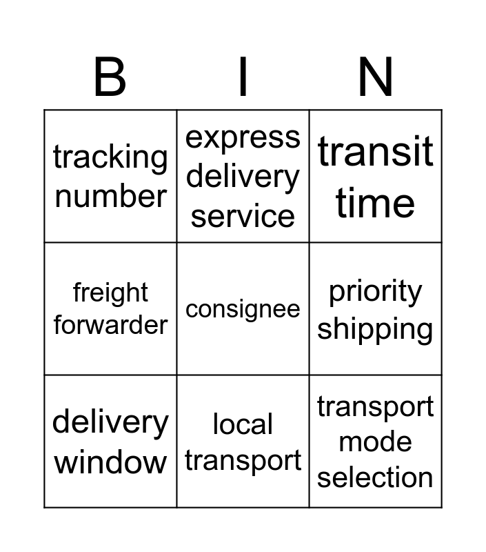 This bingo card has 31 words: Free!, freight rate, freight booking, delivery confirmation, tracking number, transit time, delivery window, route optimization, transport cost estimation, freight documentation, shipping arrangements, freight forwarder, carrier, courier, consignee, quotation, payment terms, load planning, delivery receipt, carrier, consignee, supplier / vendor, haulage contractor / haulier, express delivery service, transport mode selection, priority shipping, freight forwarder, tracking number, priority shipping, local transport and international transport.