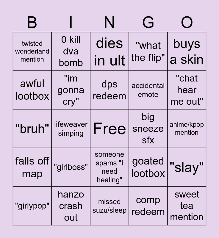 This bingo card has a free space and 24 words: "girlboss", hanzo crash out, dps redeem, "girlypop", buys a skin, twisted wonderland mention, awful lootbox, 0 kill dva bomb, big sneeze sfx, someone spams "I need healing", accidental emote, "bruh", goated lootbox, "slay", "im gonna cry", comp redeem, anime/kpop mention, dies in ult, "chat hear me out", lifeweaver simping, sweet tea mention, falls off map, "what the flip" and missed suzu/sleep.