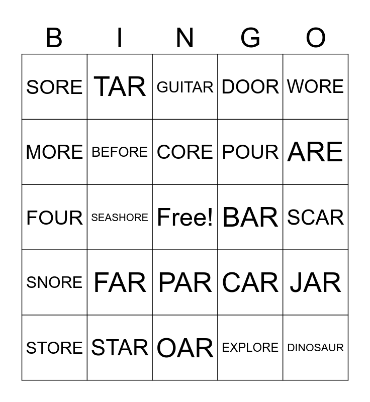 This bingo card has a free space and 24 words: FAR, STAR, CORE, STORE, WORE, SORE, MORE, TAR, BAR, PAR, POUR, FOUR, CAR, JAR, BEFORE, EXPLORE, SCAR, GUITAR, ARE, SEASHORE, DINOSAUR, SNORE, DOOR and OAR.