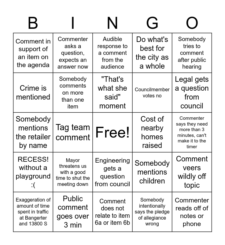 This bingo card has a free space and 29 words: Exaggeration of amount of time spent in traffic at Bangerter and 13800 S, Accident from yesterday mentioned, Tag team comment, Accusations of being beholden to money, Comment in support of an item on the agenda, Audible response to a comment from the audience, Somebody comments on more than one item, Mayor threatens us with a good time to shut the meeting down, Cost of nearby homes raised, Public comment goes over 3 min, Commenter says they need more than 3 minutes, can't make it to the timer, Commenter reads off of notes or phone, Comment does not relate to item 6a or item 6b, Somebody intentionally says the pledge of allegiance wrong, Legal gets a question from council, Planning gets a question from council, Engineering gets a question from council, RECESS! without a playground :(, Somebody tries to comment after public hearing, Somebody mentions the retailer by name, Somebody mentions children, ZZZZZZZZZ, somebody's asleep, Councilmember votes no, Crime is mentioned, Do what's best for the city as a whole, Commenter asks a question, expects an answer now, Comment veers wildly off topic, "That's what she said" moment and Somebody tries to be the last commenter.